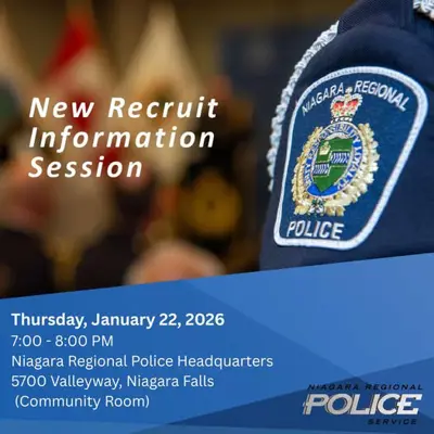 The Niagara Regional Police Service (NRPS) Recruiting Unit is holding a new recruit information session on January 22, 2026, at the NRPS Headquarters Community Room, 5700 Valley Way, Niagara Falls.