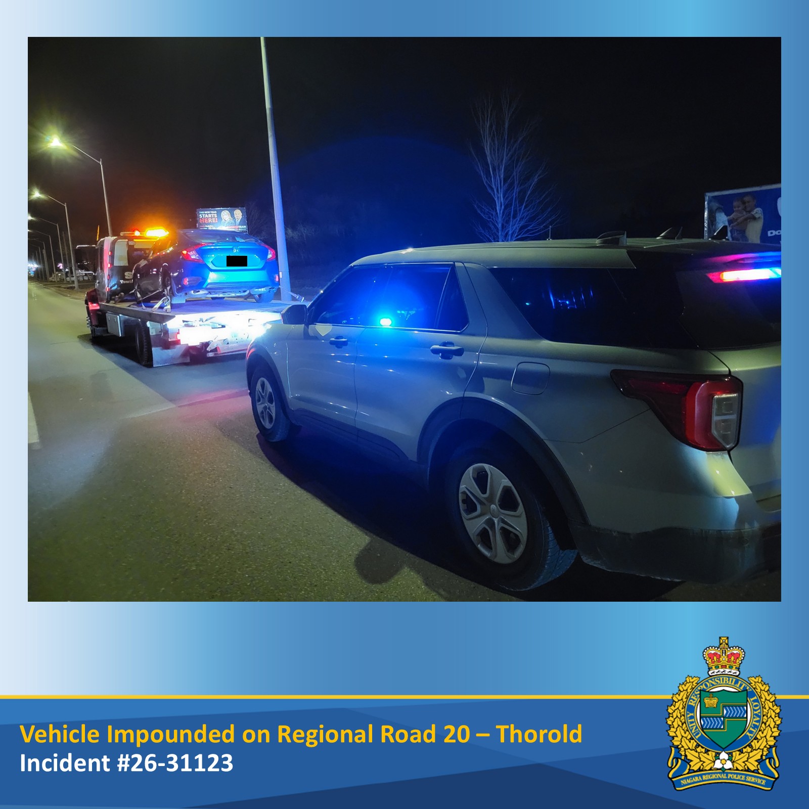 That officer stopped a vehicle travelling 93km/h in a posted 50km/h zone. A 62-year-old male driver from Niagara Falls was charged with Drive Vehicle While Performing a Stunt and Speeding. His licence was suspended for a period of 30 days, and his vehicle was impounded for 14 days. (NRPS Inc 26-30519)